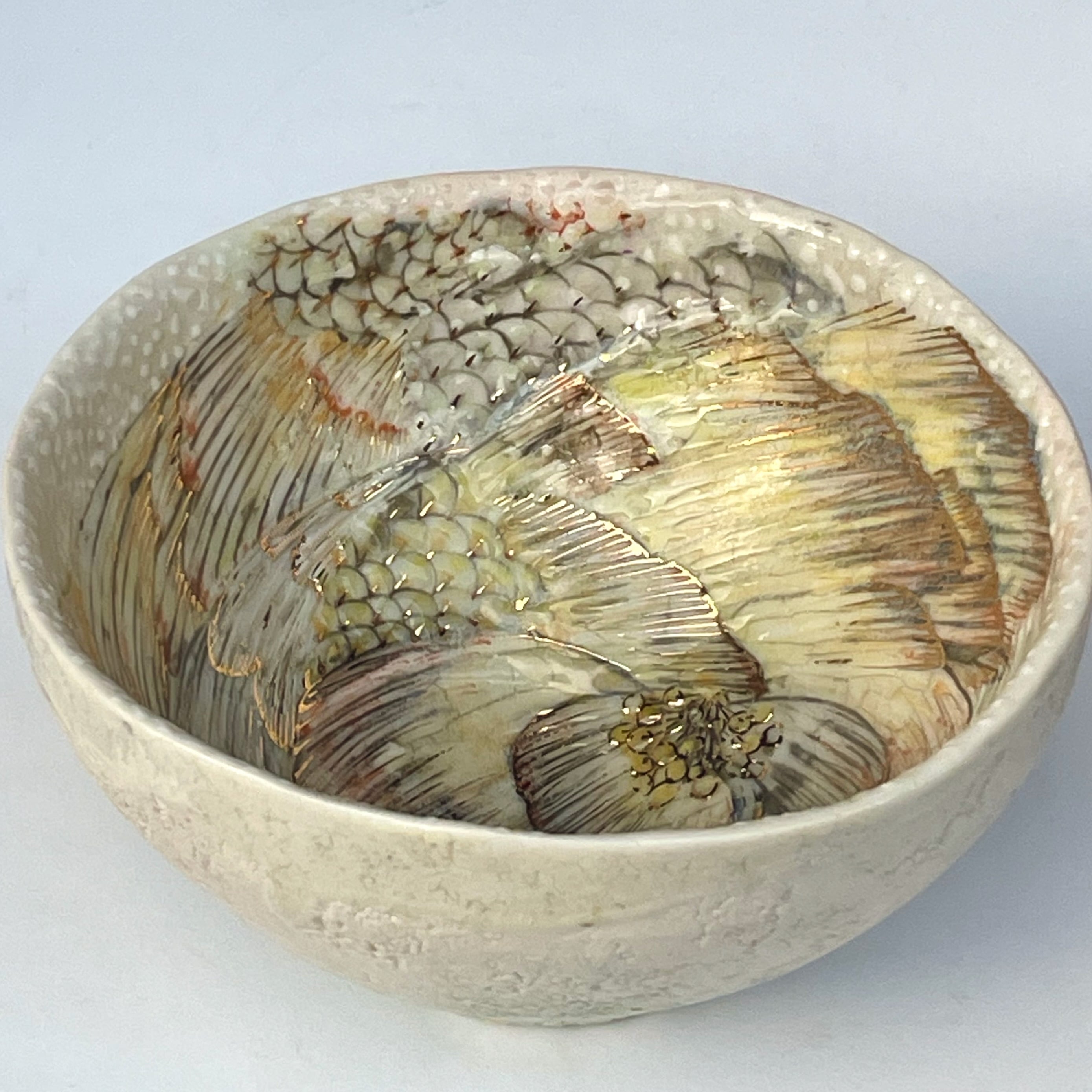 内面の華やかな雰囲気とは対照的に、やさしい色彩の外観。やわらかな土の質感を手に持っても楽しめます。高台の周りには金彩が散りばめられています。
