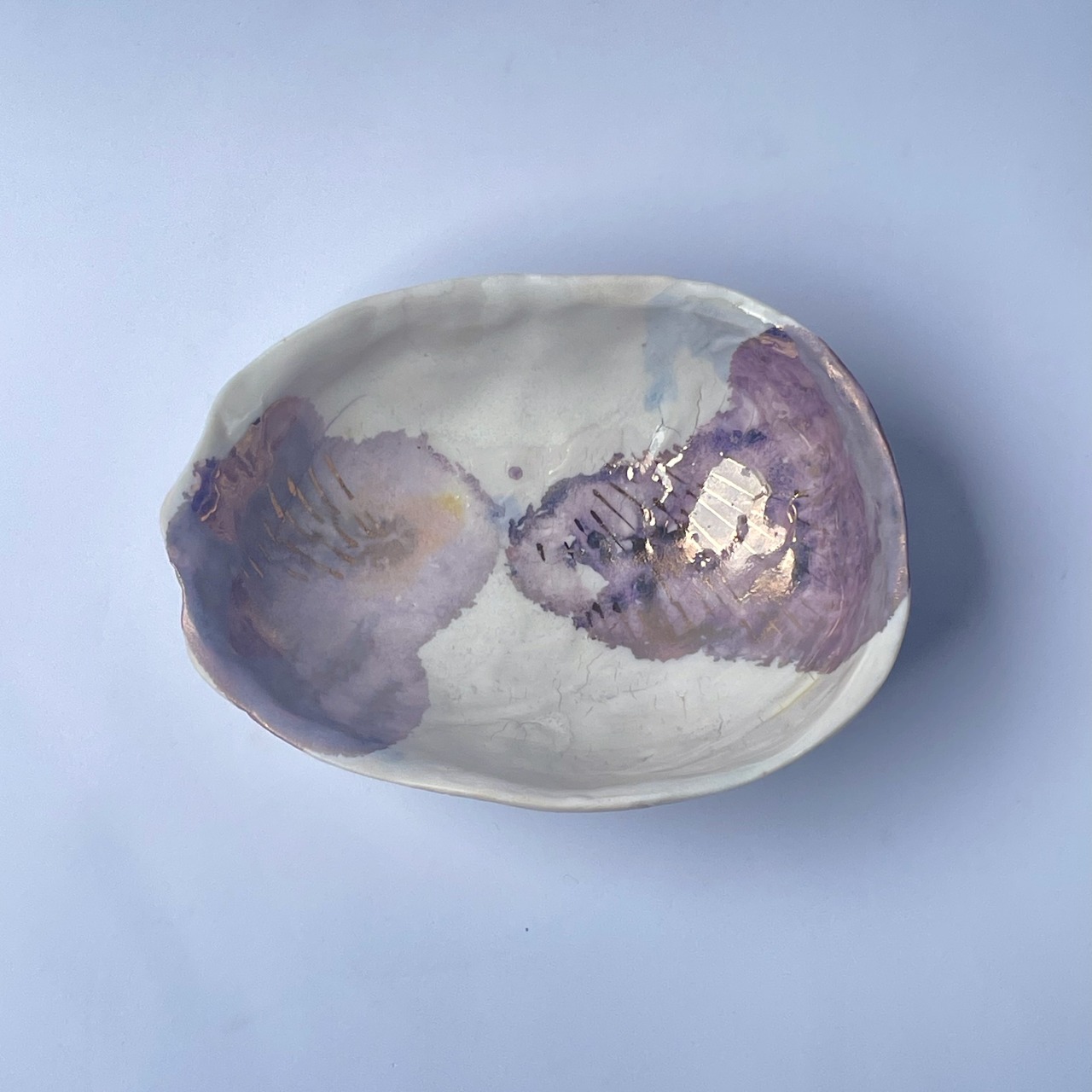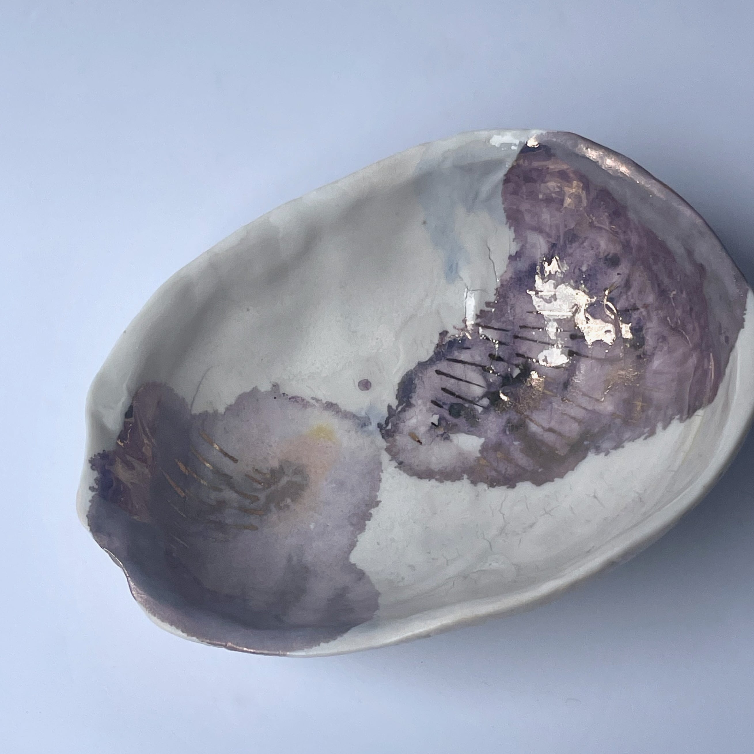 富山県で作陶する神谷麻穂さんの器は、やわらかな色彩と独特のテクスチャーを特徴としています。友禅のような上品な色合い、輝きをまとうパステルのまばゆさ。心象風景を描いた抽象画が描かれた絵皿には、実にさまざまな技法が使われています。