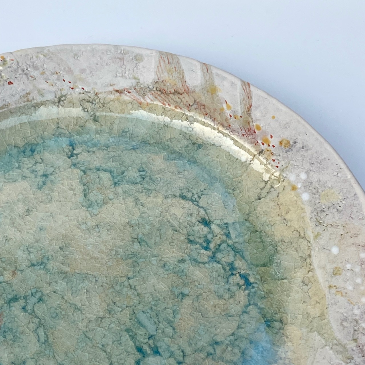 富山県で作陶する神谷麻穂さんの器は、やわらかな色彩と独特のテクスチャーを特徴としています。友禅のような上品な色合い、輝きをまとうパステルのまばゆさ。心象風景を描いた抽象画が描かれた絵皿には、実にさまざまな技法が使われています。