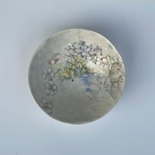 富山県で作陶する神谷麻穂さんの器は、やわらかな色彩と独特のテクスチャーを特徴としています。友禅のような上品な色合い、輝きをまとうパステルのまばゆさ。心象風景を描いた抽象画が描かれた絵皿には、実にさまざまな技法が使われています。