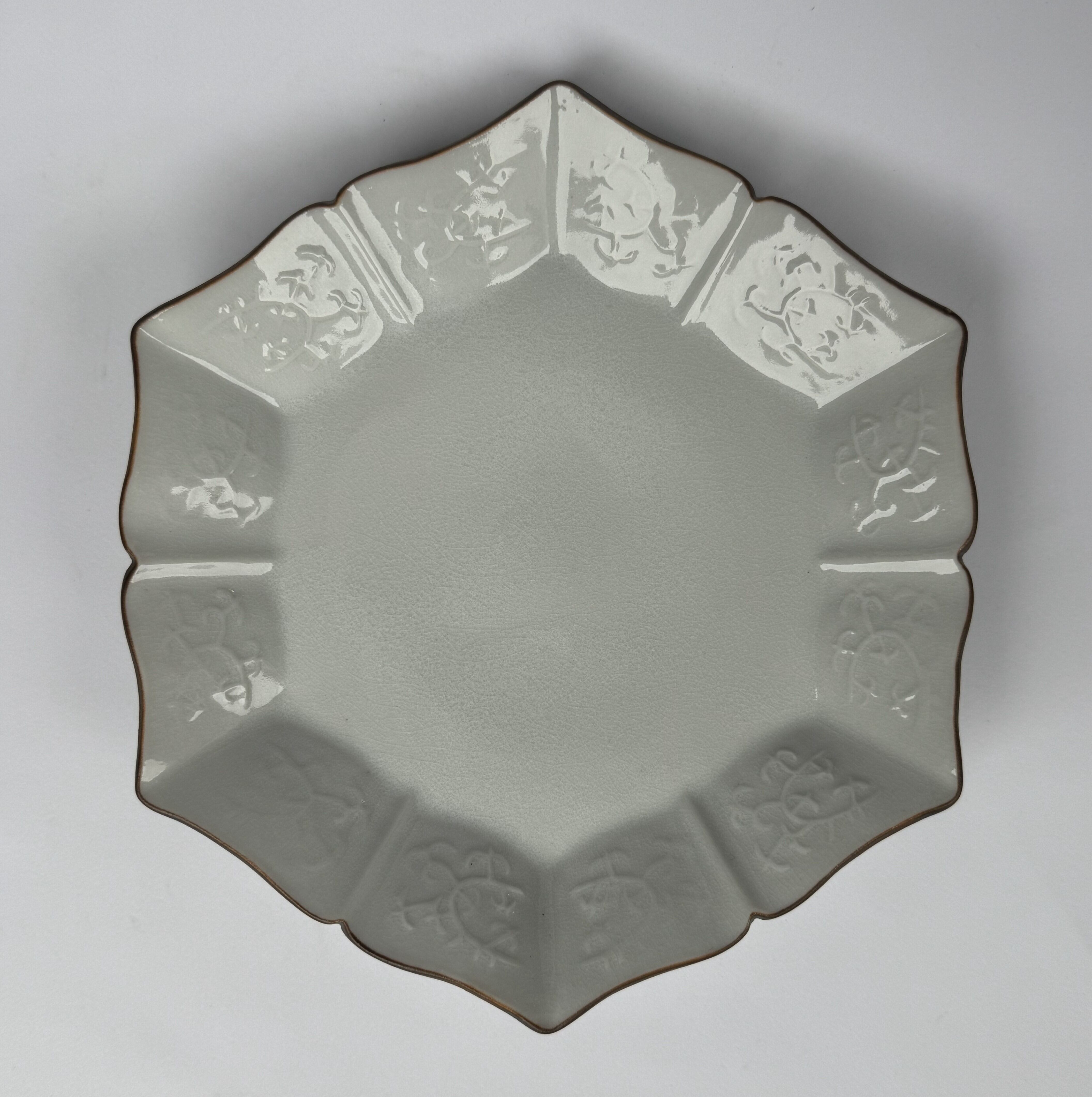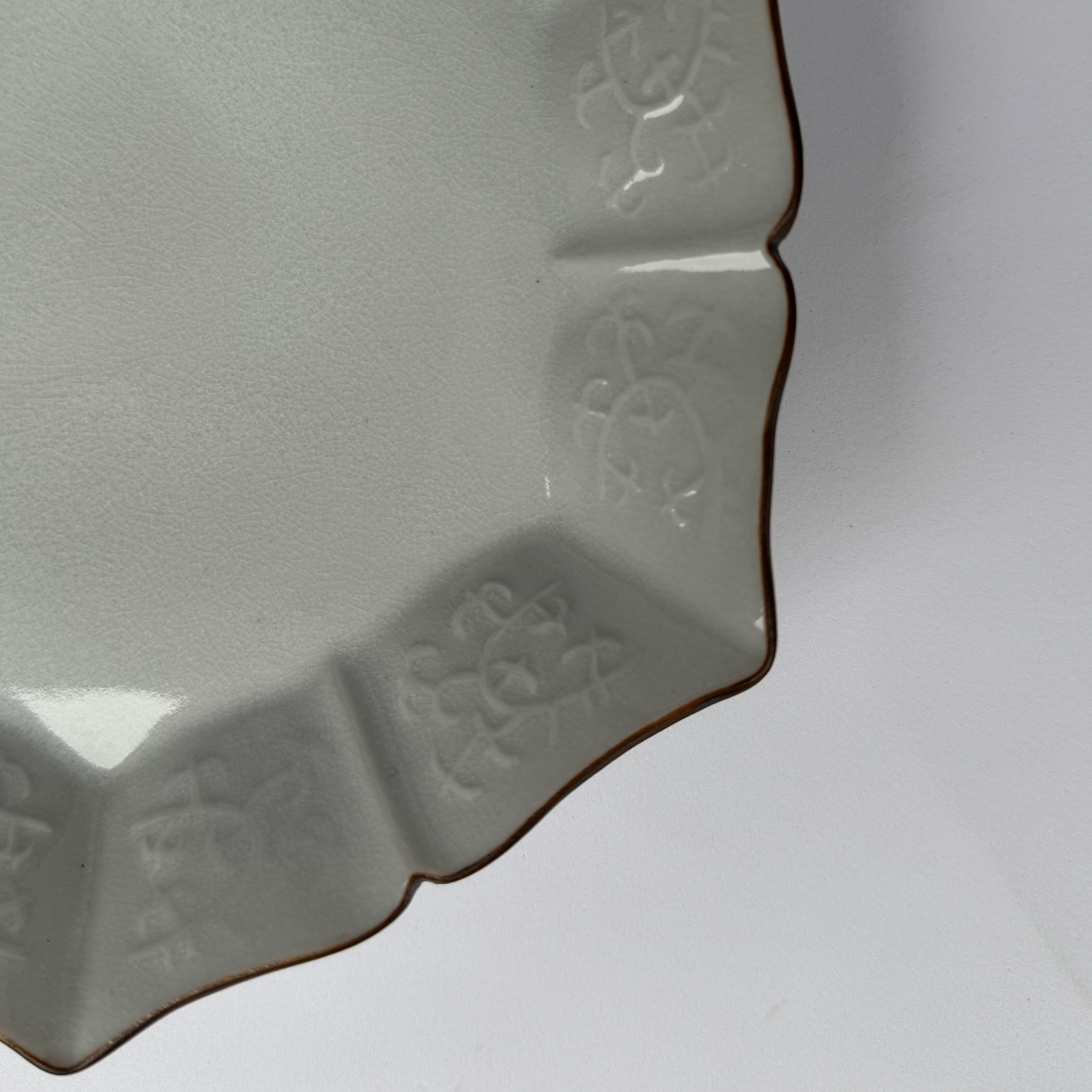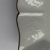 轆轤(ろくろ)で挽いた生乾きの素地に型にかぶせて叩き、型の形や型に掘られた文様を写し取る技法です。この技法は、磁器の製造が始まった17世紀初期から行われてきました。これにより、轆轤成形による正円を基礎としながら、轆轤でできない多角形や花形などの複雑な形の器が可能となります。