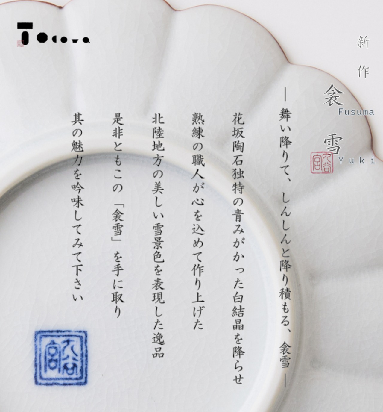 いまでは貴重となった花坂陶石100%の九谷焼白磁の美しさをご堪能ください。