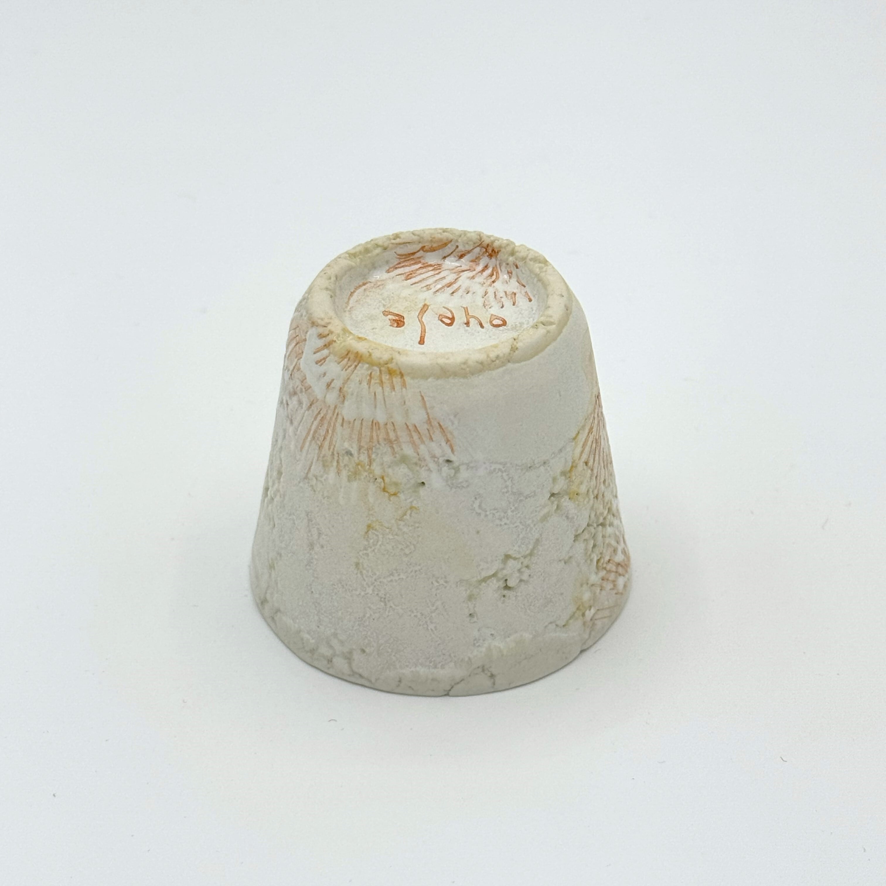 轆轤(ろくろ)を引いて作った石膏型に、通常の湿った土のほか、そぼろ状の乾いた土を重ねる珍しい手法を用いることで、土ざわりを感じる質感に仕上げています。さらに刷毛で砂をかけたり、別の土を埋め込んで象嵌を施したり、時には削り出して形を整えたり。さまざまな技法を用いることでオリジナリティのある作品に仕上げています。
