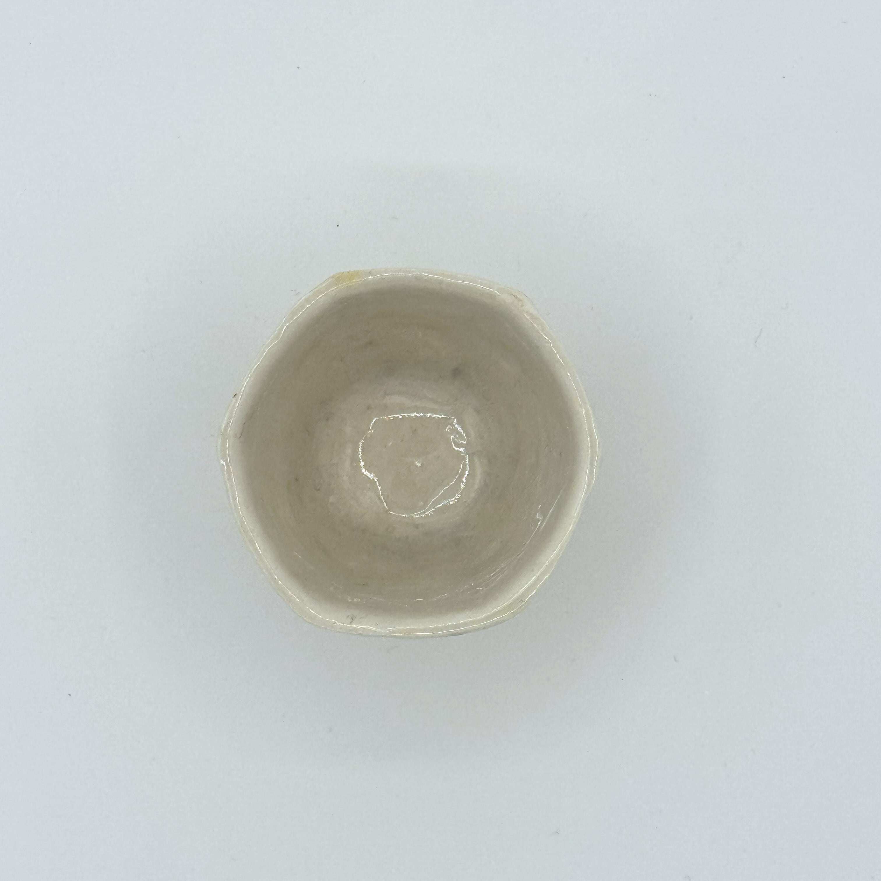 なだらかな六角形、白い釉薬で凹凸を伴った模様が魅力的。