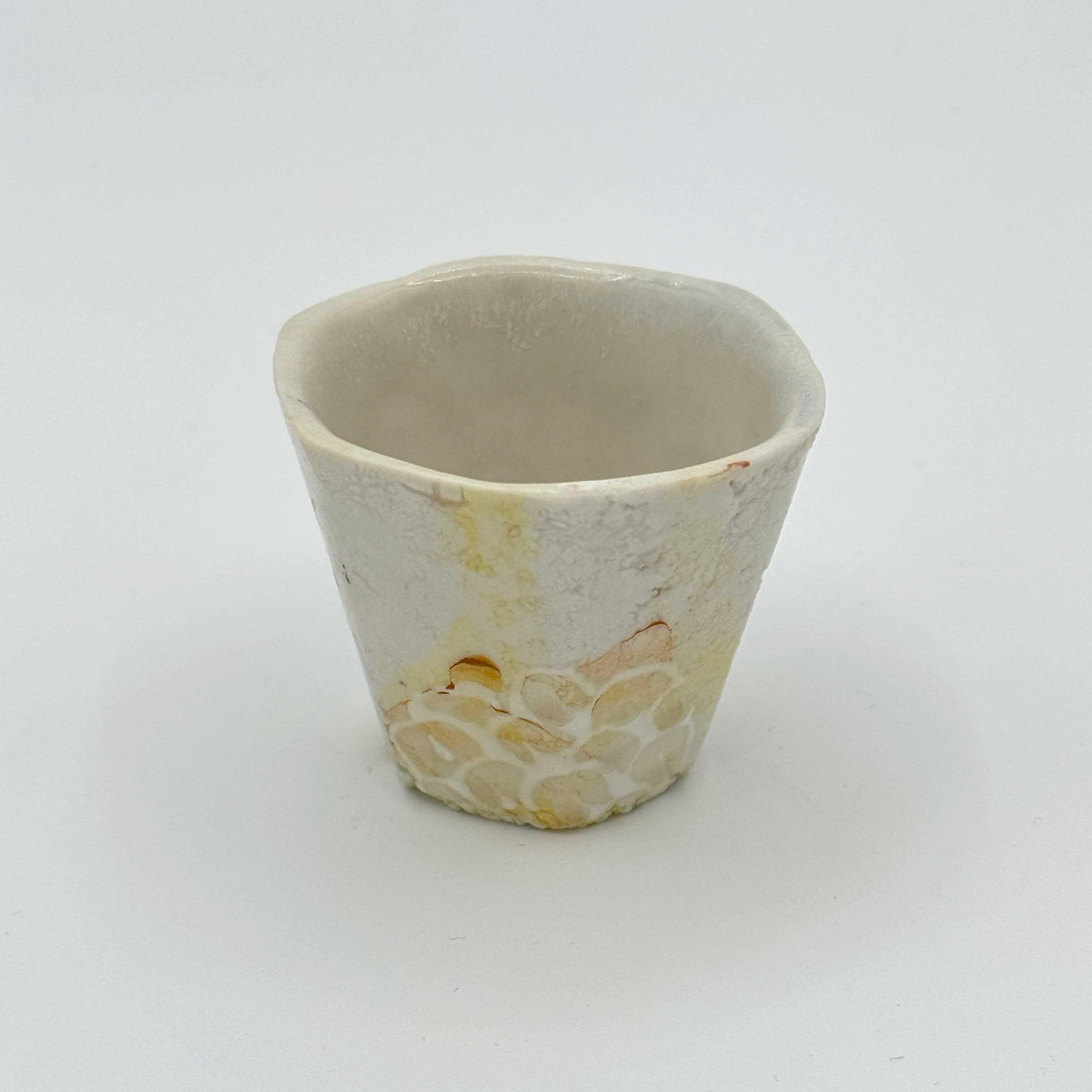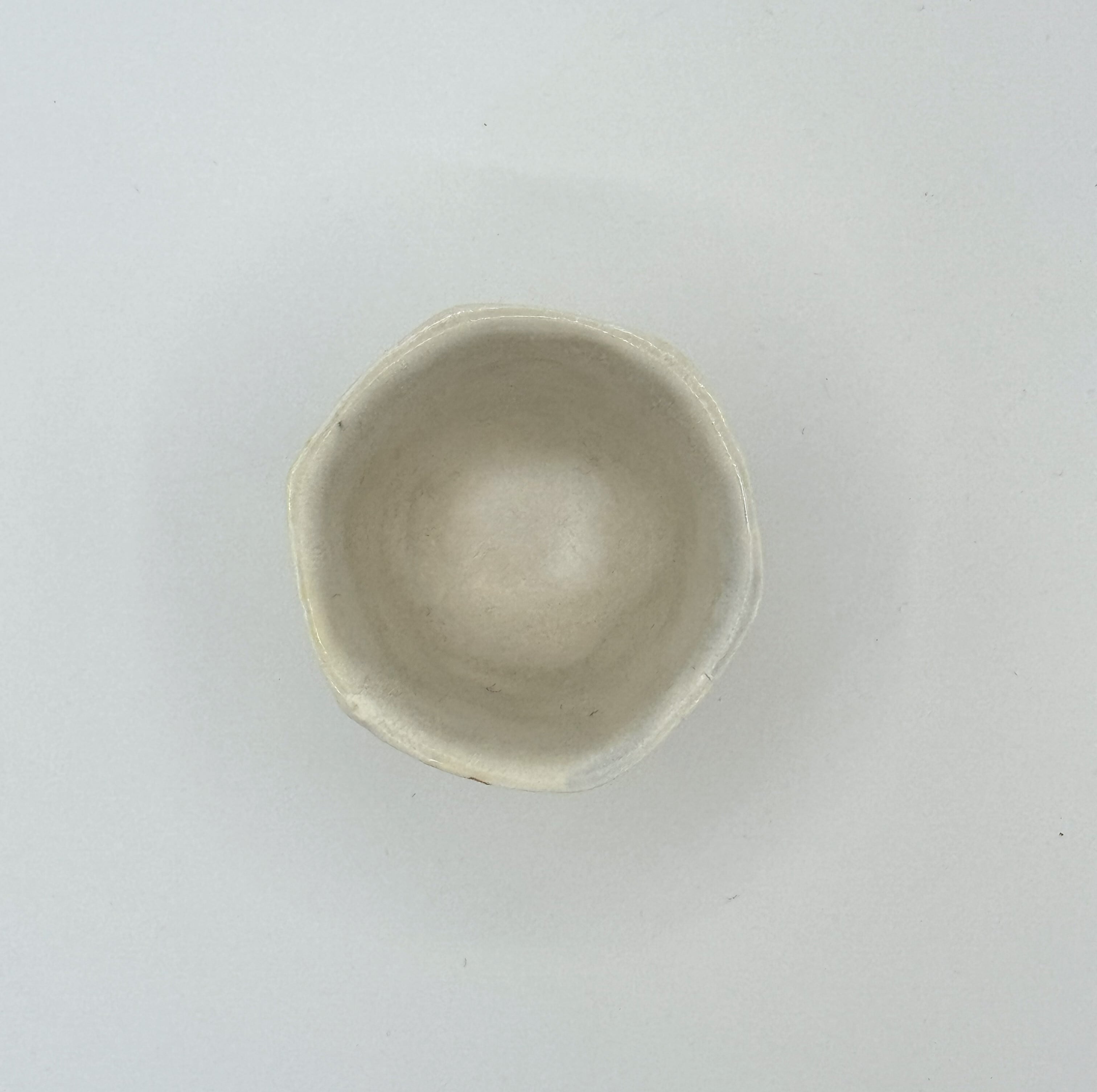 なだらかな六角形、白い釉薬で凹凸を伴った模様が魅力的。