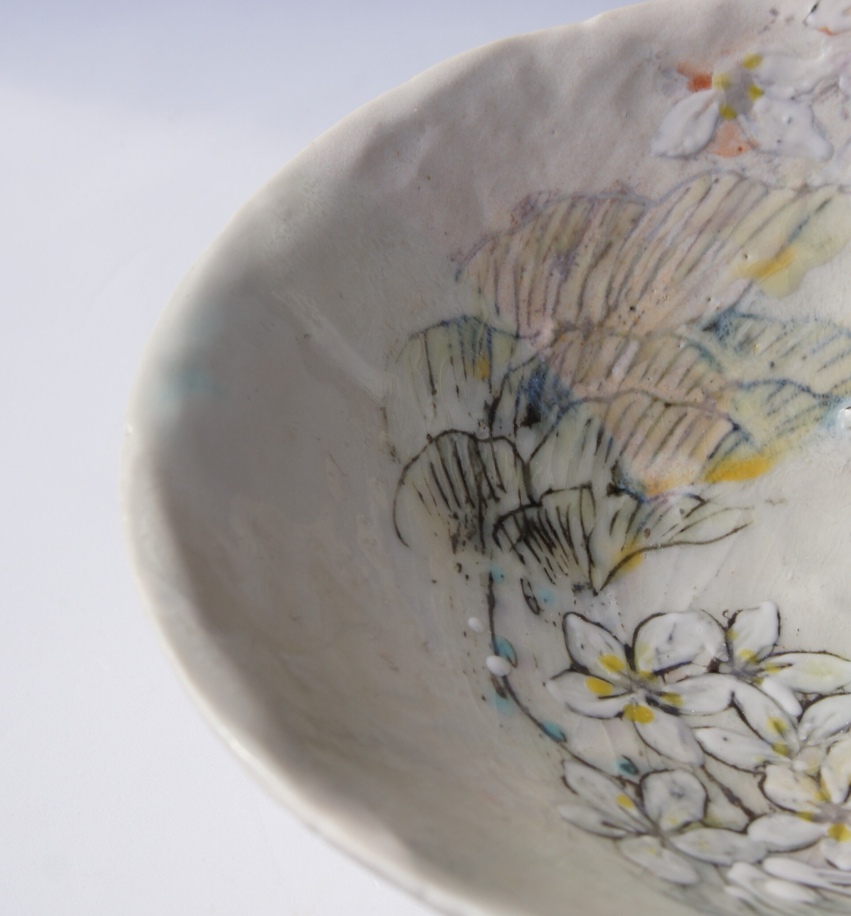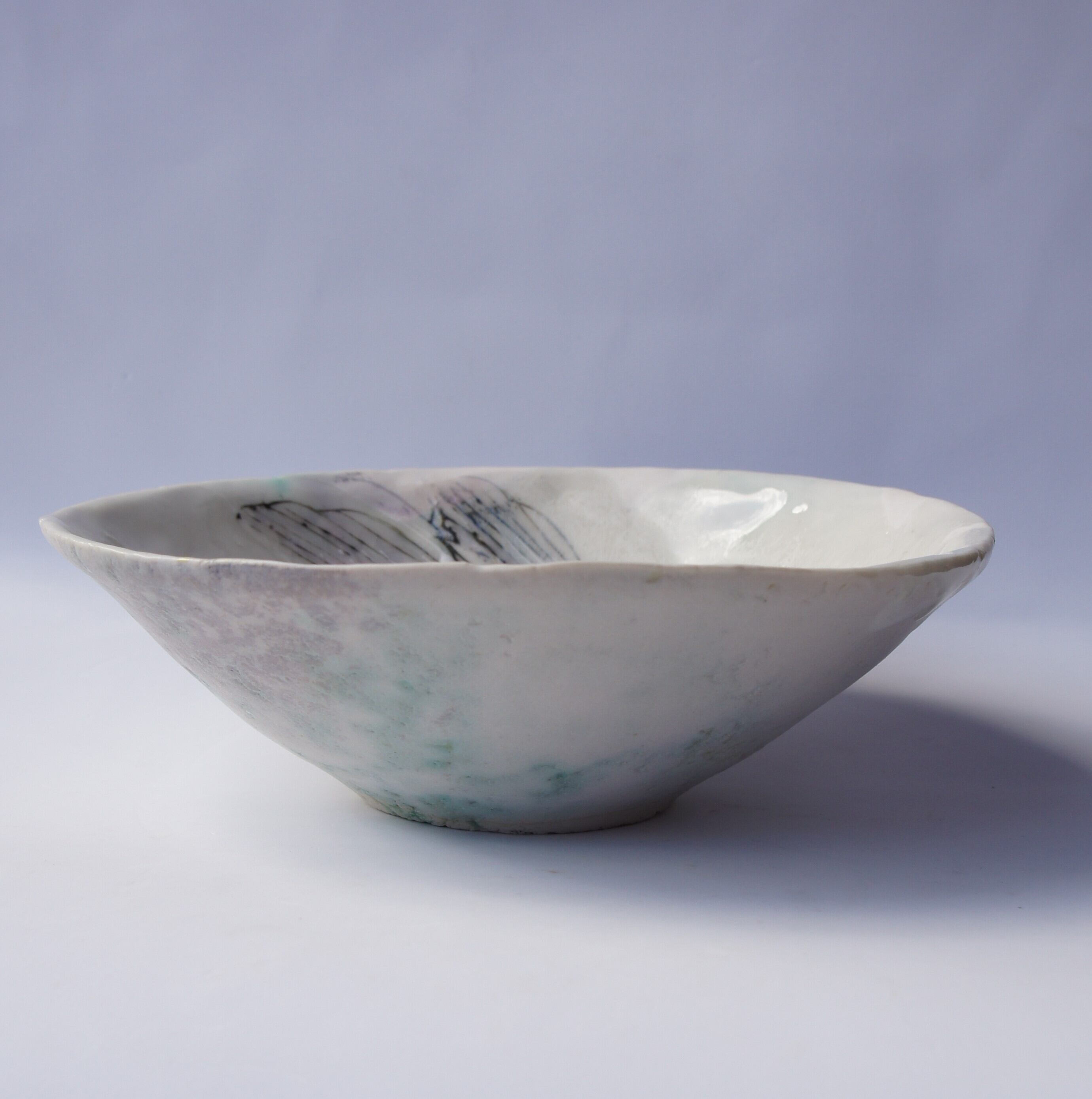 鮮やかな線に淡い色を重ね、パール釉や白マットなども施しています。