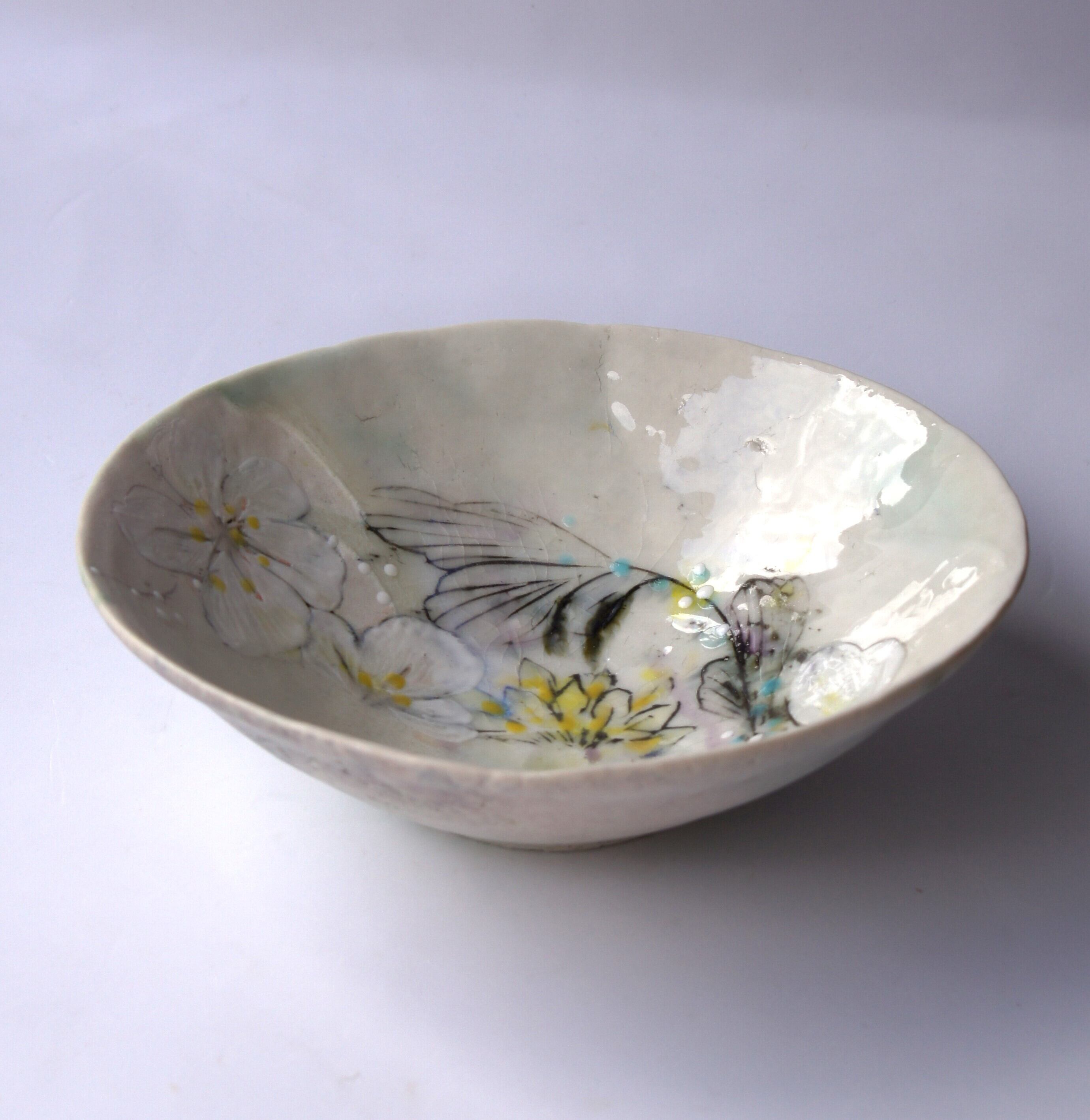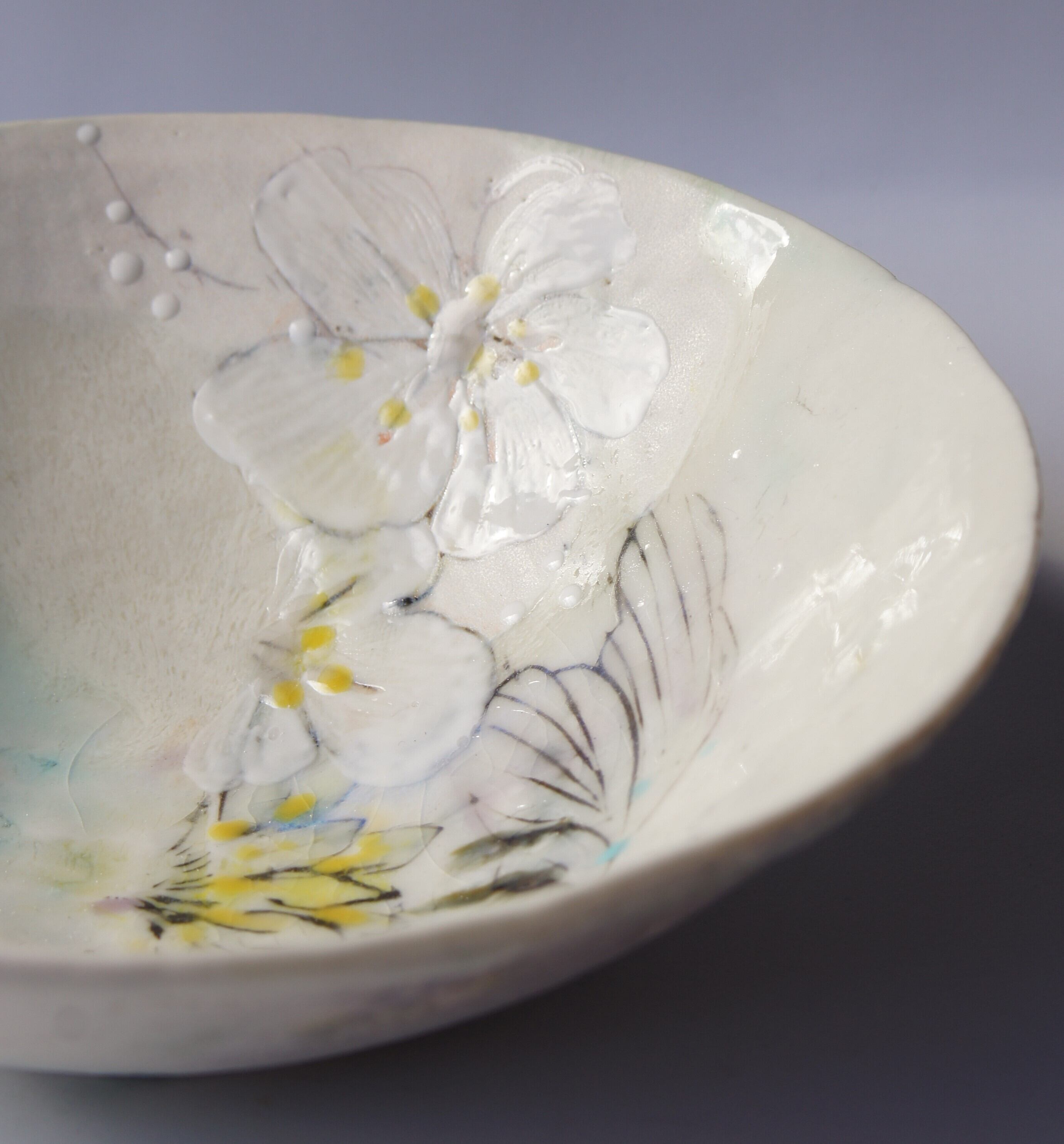 鮮やかな線に淡い色を重ね、パール釉や白マットなども施しています。