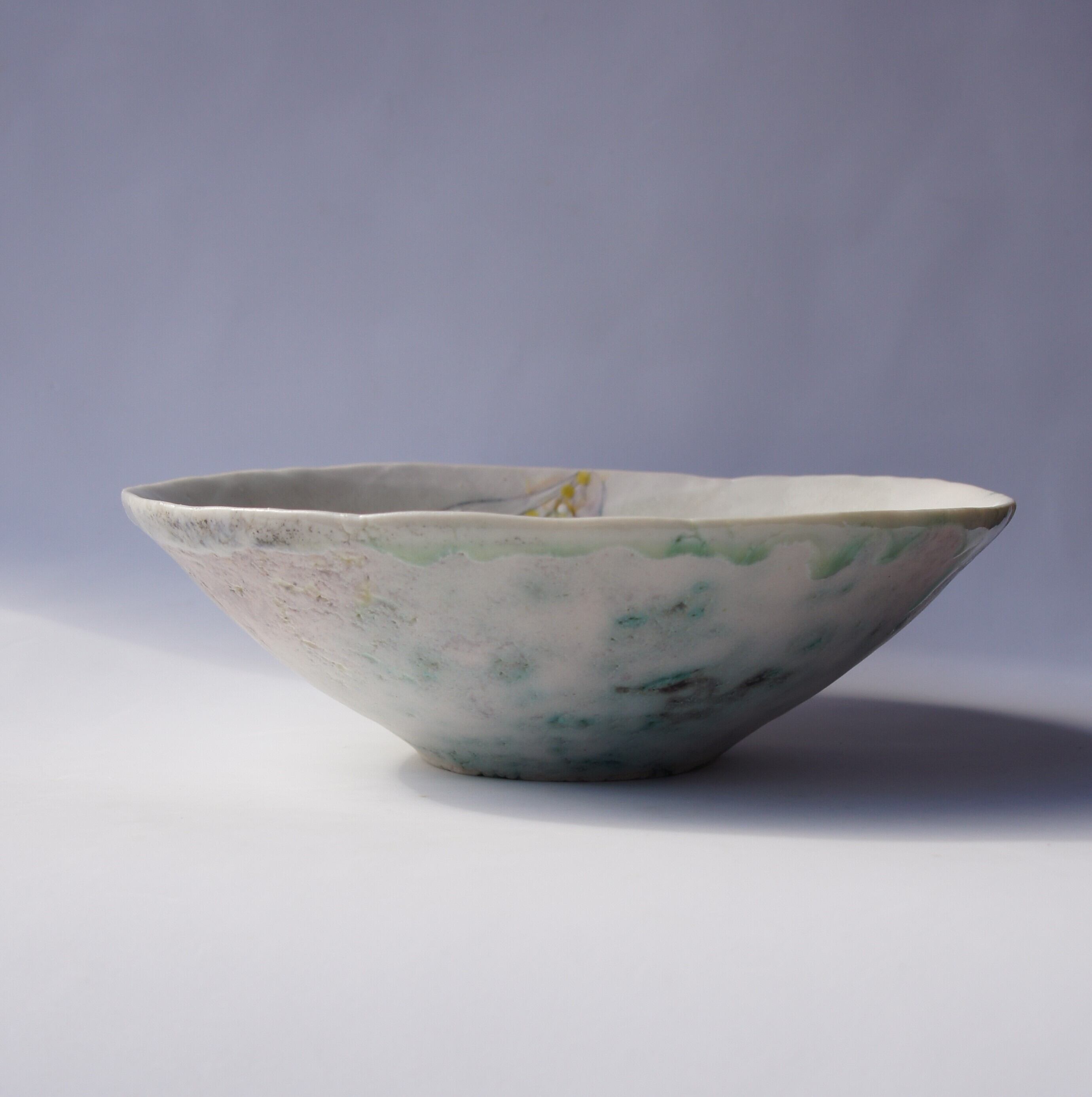 ざらざらした土の感触やでこぼこした表面、真っ直ぐではないライン、繊細な絵付けや釉薬の風合い。複雑な要素が散りばめられ、器としては使い勝手がいいとは言えないかもしれません。けれど、心を潤す器は日常をゆたかに変えてくれます。アートは心の栄養。この器に美味しい料理を盛り付けて食卓に並べたら、心も体もどちらも一度で満たされてしまう。一石二鳥とはまさにこのこと。とても贅沢な心地になる器なのです。