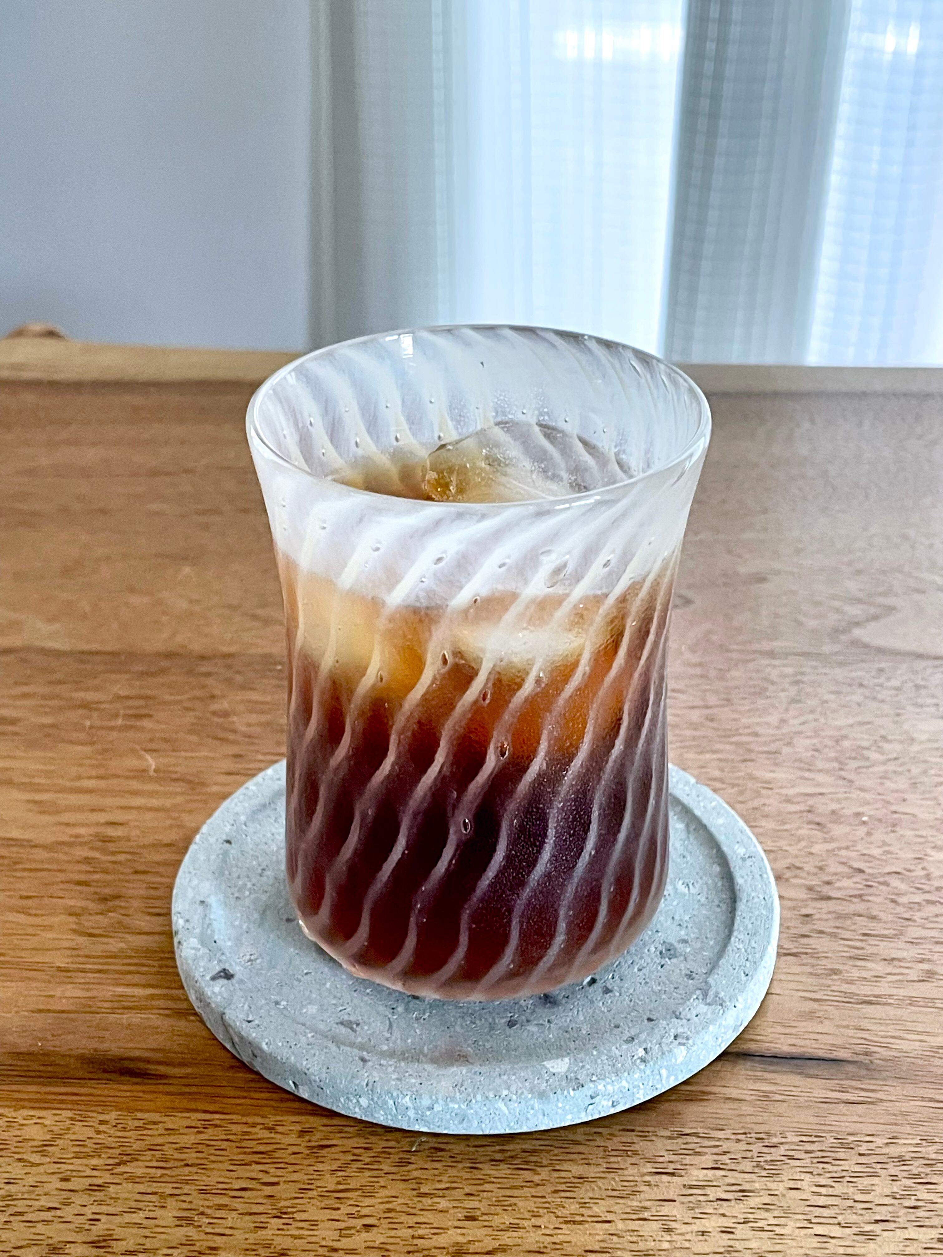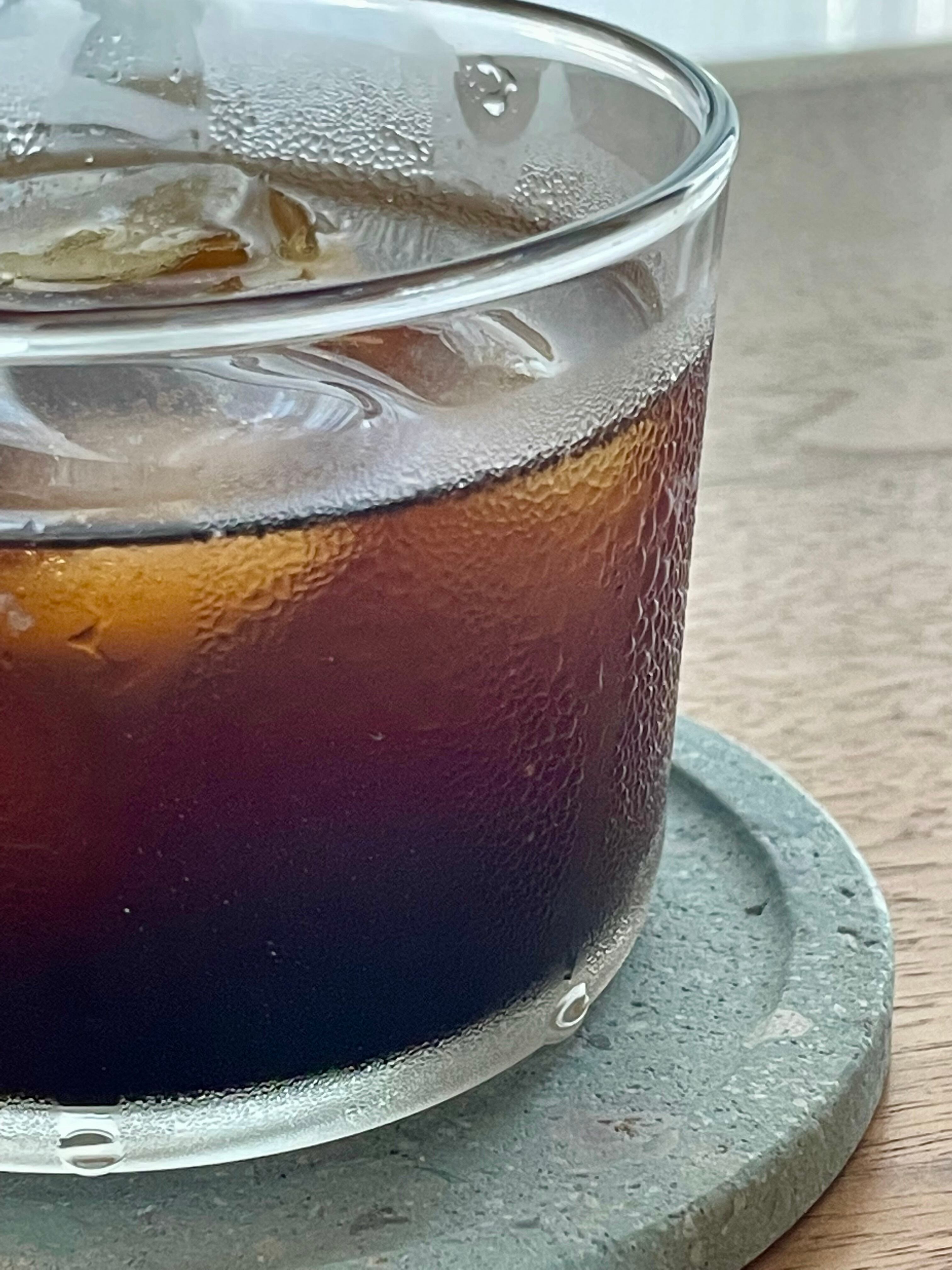 冷たいグラスから流れ落ちる水滴が表面を濡らし、